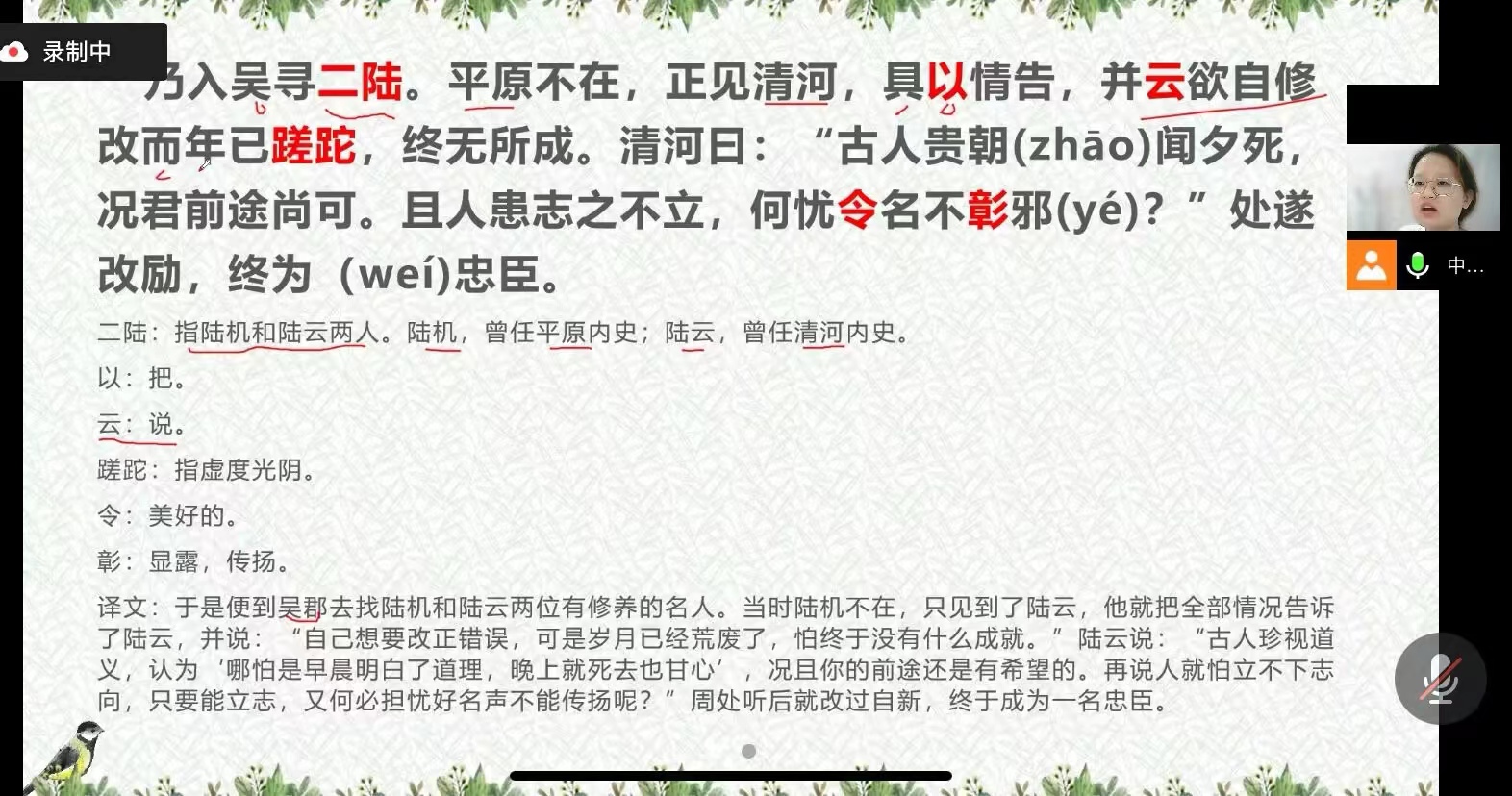志愿者们借助腾讯会议,围绕“周处除三害”展开了详细的讲解。志愿者们首先简单介绍了周处的人物背景,随后通过朗读课文的形式纠正同学们的读音问题。课堂上,志愿者采取重点标红、易读错字反复强调、字字落实翻译、随机抽取同学提问等方法为同学们细致地讲解课文。在课程的最后,澳门六合彩App