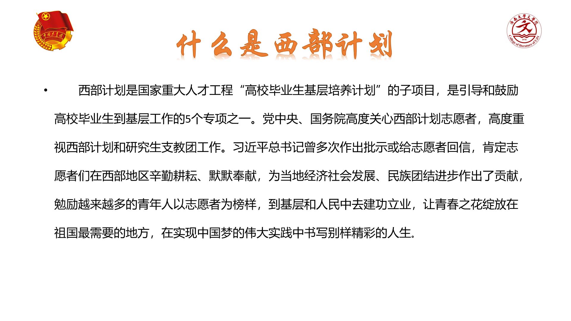 将进一步加强对“西部计划”的宣传力度,全力完善各项体制机制,秉持“为党育人、为国育才”的理念,力争让更多文院学子了解西部计划,为有志于参与西部建设的同学进一步做好服务,保驾护航。