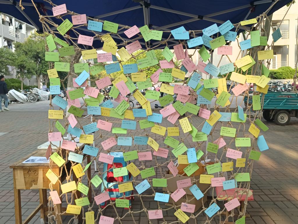 和协会的大力支持下,志愿者们为本次活动购入了充足的活动物资,包括玩偶服、徽章、装饰品等,为活动提供了物质保障。活动正式开始后,身着玩偶服的同学迅速进入状态,积极热情地同参与活动的同学互动,现场氛围十分活跃。同学们情绪高涨,和玩偶挥手、拥抱、合照,并且在心灵展板上写下了自己的愿望和祝福,原本空荡荡的绳网被同学们的愿望卡片点缀得色彩纷呈,本次活动圆满结束,受到同学们一致好评。