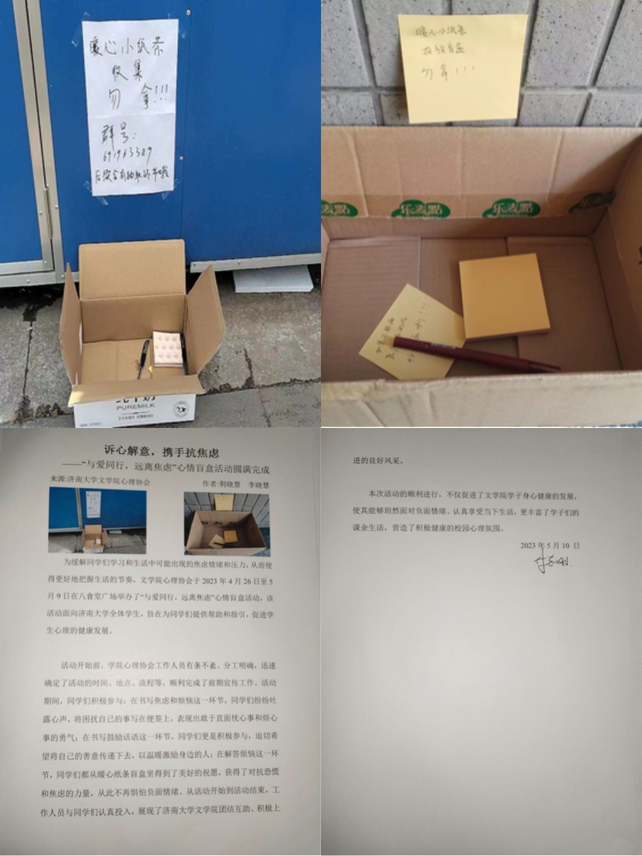心理协会工作人员有条不紊、分工明确,迅速确定了活动的时间、地点、流程等,顺利完成了前期宣传工作。活动期间,同学们积极参与:在书写焦虑和烦恼这一环节,同学们纷纷吐露心声,将困扰自己的事写在便签上,表现出敢于直面忧心事和烦心事的勇气;在书写鼓励话语这一环节,同学们更是积极参与,迫切希望将自己的善意传递下去,以温暖激励身边的人;在解答烦恼这一环节,同学们都从暖心纸条盲盒里得到了美好的祝愿,获得了对抗恐慌和焦虑的力量,从此不再惧怕负面情绪。从活动开始到活动结束,工作人员与同学们认真投入,展现了澳门六合彩App