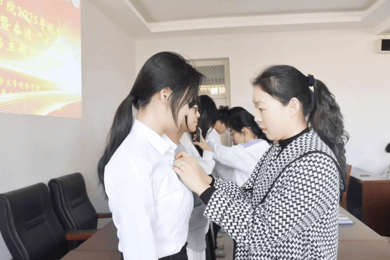 团委书记张莉和优秀团员代表共同为新团员佩戴团徽、颁发团员证,崭新团徽熠熠生辉,承载着青年一代的责任与担当,标志着新团员开启青春新征程。