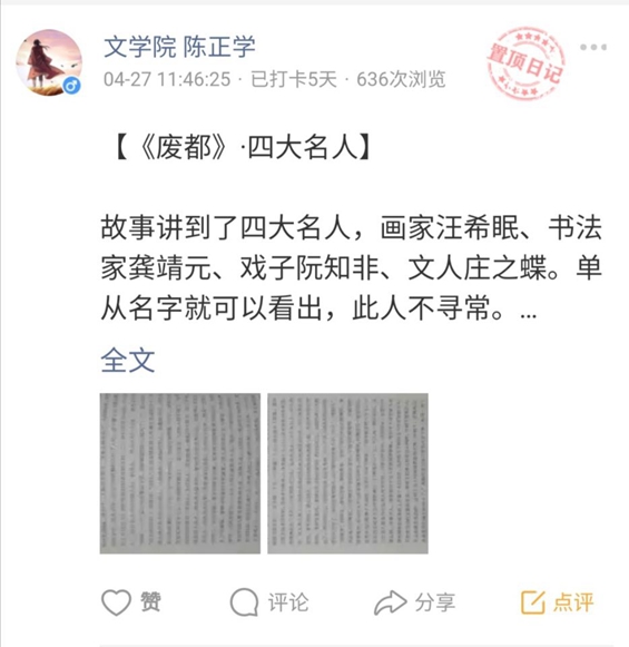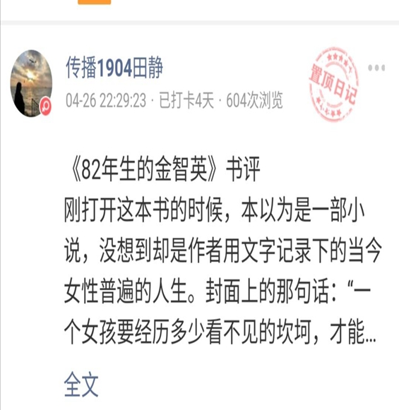 陈正学在小程序上分享了自己对于《废都》的独特理解与感悟,获得了许多人的点赞。2019级田静同学分享了自己阅读的书目《82年生的金智英》,在评论区引起了热烈的讨论。