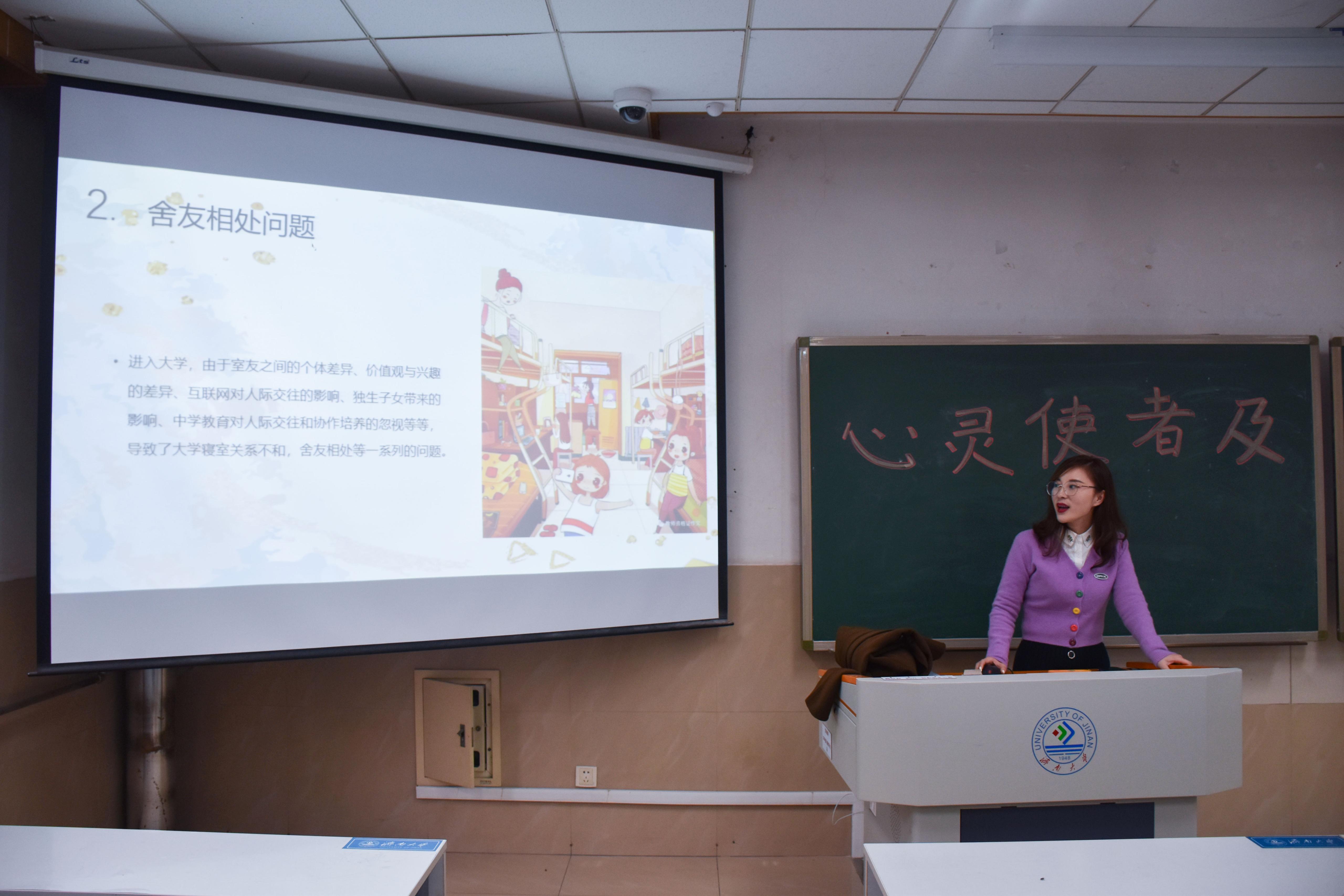 赵丽丽老师为心灵使者、联络员们进行培训,内容为心灵使者详解及心理协会的主要工作、心理健康的重要性、大学生常见心理问题、大学生活指南四部分。培训会上,赵老师生动地阐释了关于心理健康的知识,强调心灵使者们应当从自身出发,保持良好的心理健康,善于观察周围的环境,多与同学们沟通,才能更好地为同学们服务。同时在场的心灵使者、联络员们积极发表自己对心理健康的观点,与老师进行深入的沟通。最后,赵老师表达了对心灵使者、联络员们未来工作的期许,希望同学们拥有轻松愉悦的大学生活。活动在欢乐活跃的氛围中圆满结束。
