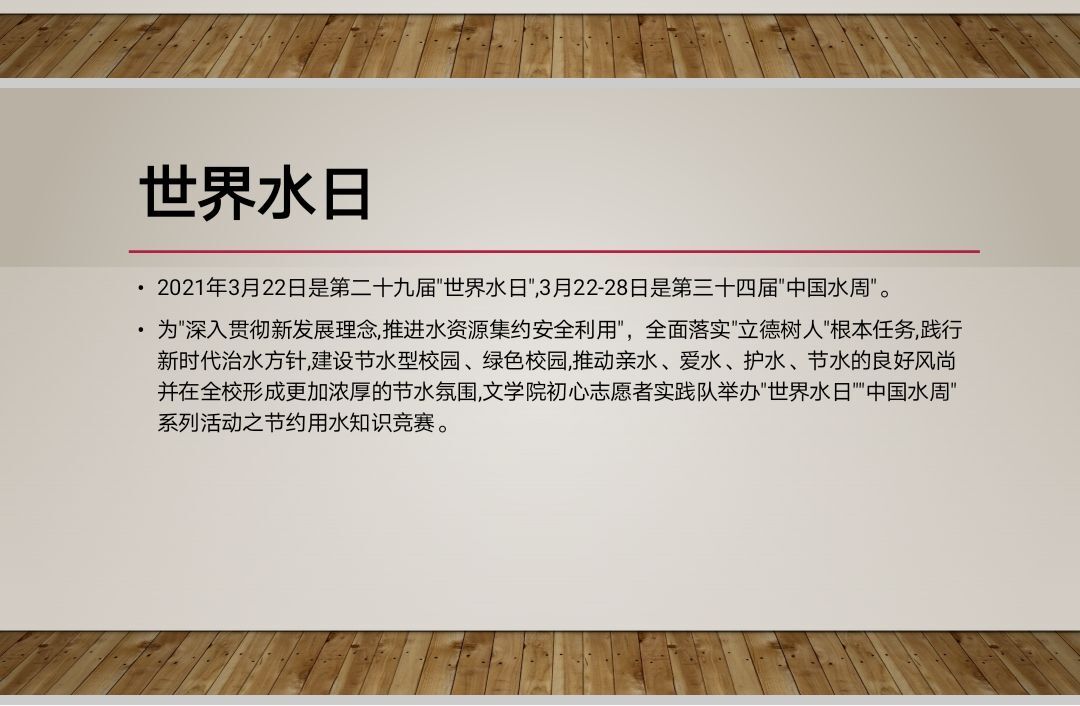 2021年3月22日是第二十九届“世界水日”,3月22-28日是第三十四届“中国水周”。为提高同学们的节水意识,推动形成亲水、爱水、护水的良好风尚与更加浓厚的节水氛围, 3月25日晚上7点,澳门六合彩App