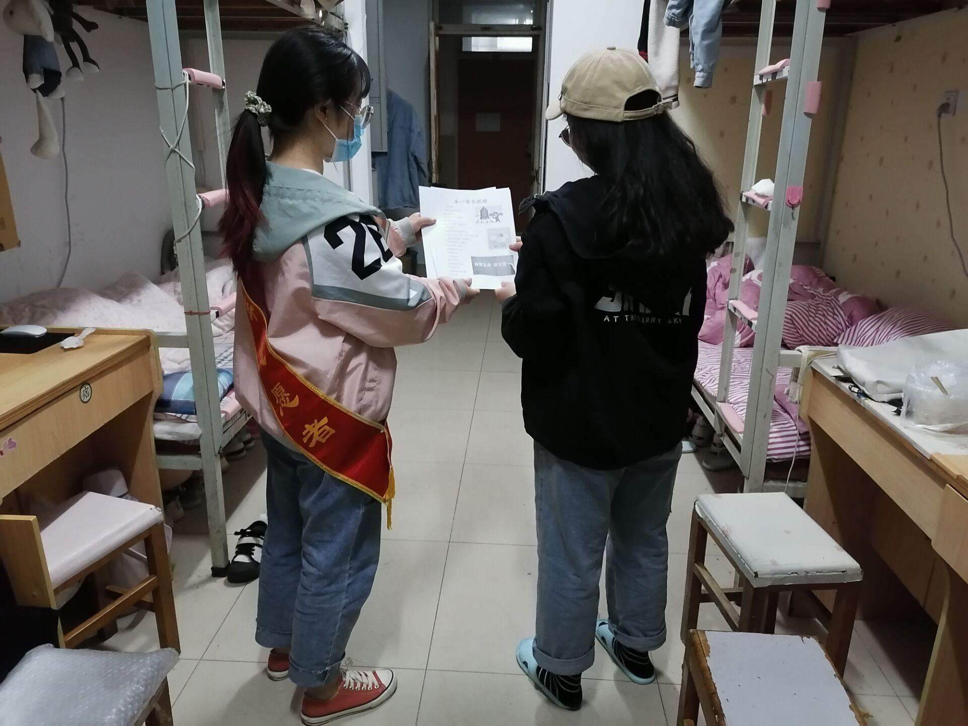 活动进行当天,志愿者们走进学生宿舍,面对面地与同学们交流五一假期安全知识,分发“五一假期安全知识”宣传单。志愿者们持续保持着高度的热情,积极宣讲“五月假期”相关安全知识并与同学们展开互动,解答同学们假期安全的相关知识,提高了同学们进一步了解假期安全出行的积极性。 最后,在全体志愿者的努力下,本次活动顺利结束,志愿者们对本次活动的出彩和不足之处进行了认真的分析总结,对下一次活动的开展提出新的期望。