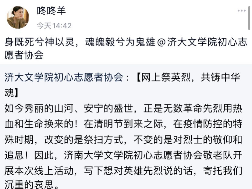 全体同学举办“清明线上缅怀先烈”活动,呼吁同学们网上祭英雄,共铸中华魂。