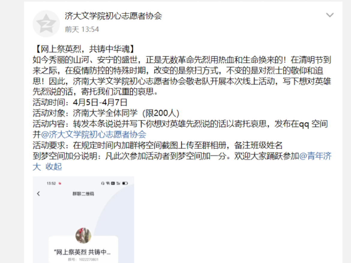 志愿者协会工作人员充分考虑清明节时期的节日特征,结合疫情当下学生们的心理活动,确定了活动主题,并广泛宣传。活动过程中,同学们积极参与,通过在QQ空间发表动态的方式缅怀先烈,讲述先烈的伟人事迹,用文字传达了怀念与哀思。本次活动积极跟进,前期宣传收获了广大同学的热情支持,讲述伟人事迹,用文字表达哀思,传承百善孝为先的中国优秀传统文化,在和平的年代不忘感谢为我们生存和发展做出巨大贡献的英雄们。