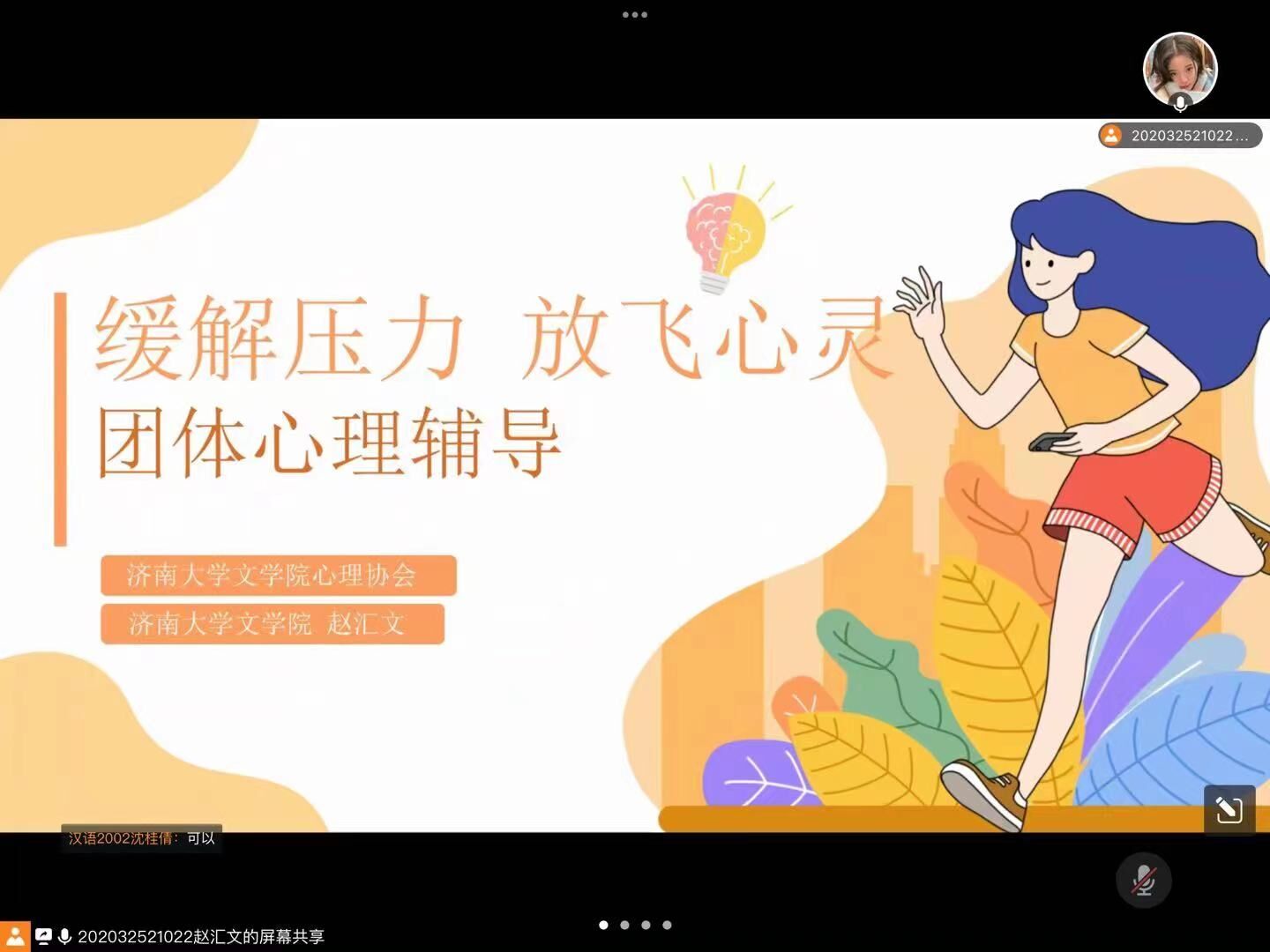 心理协会主办的心理团体辅导活动于线上顺利举办。本次活动旨在通过朋辈交流缓解压力,让文院学子在团体辅导和趣味测试中有所感悟和收获,积极面对学习、生活上的困难。