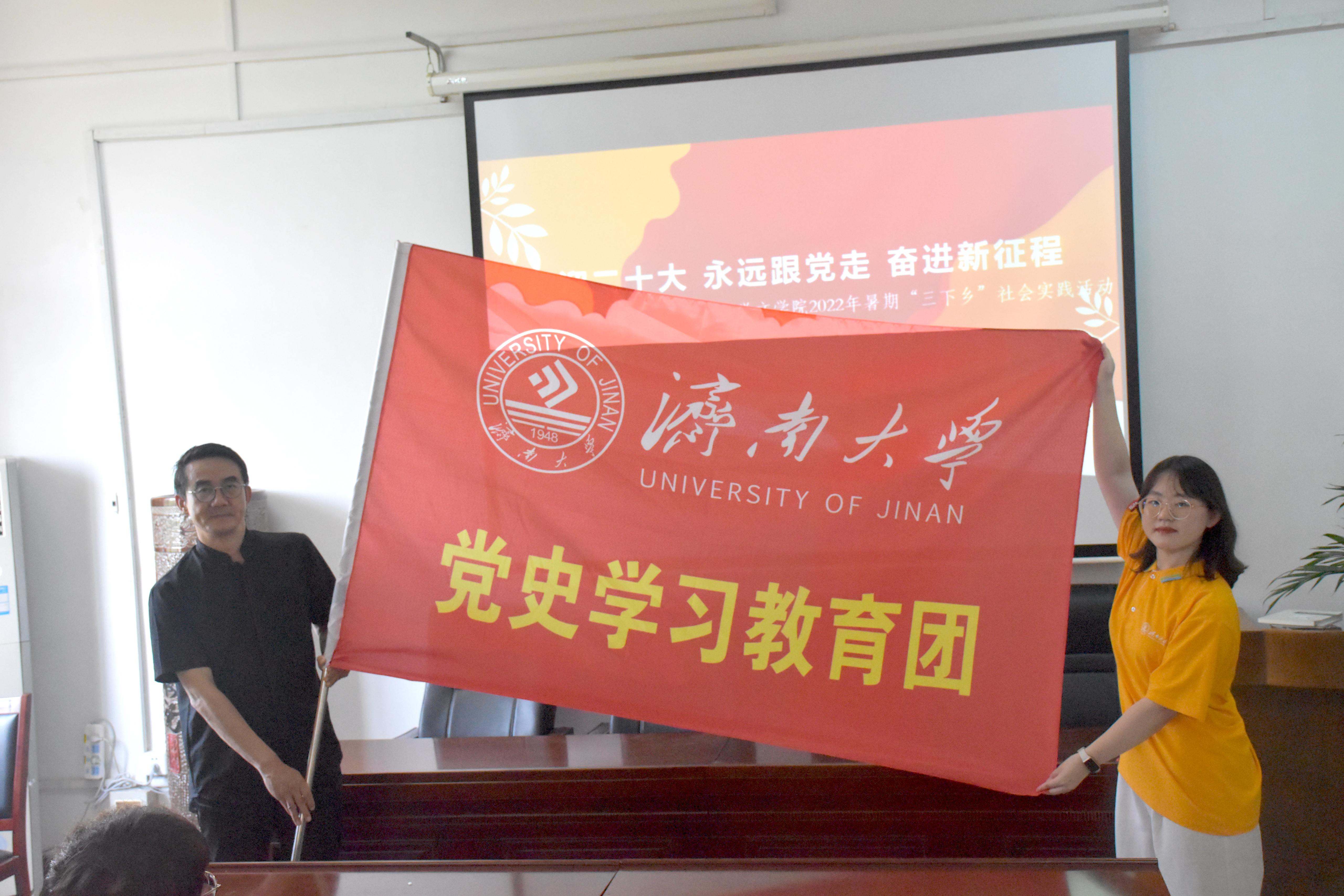 党委书记陈卫东向社会实践团队代表授旗并勉励大家练就过硬本领,将青春奉献在党和国家最需要的地方去。随后,全体社会实践团成员合影留念。