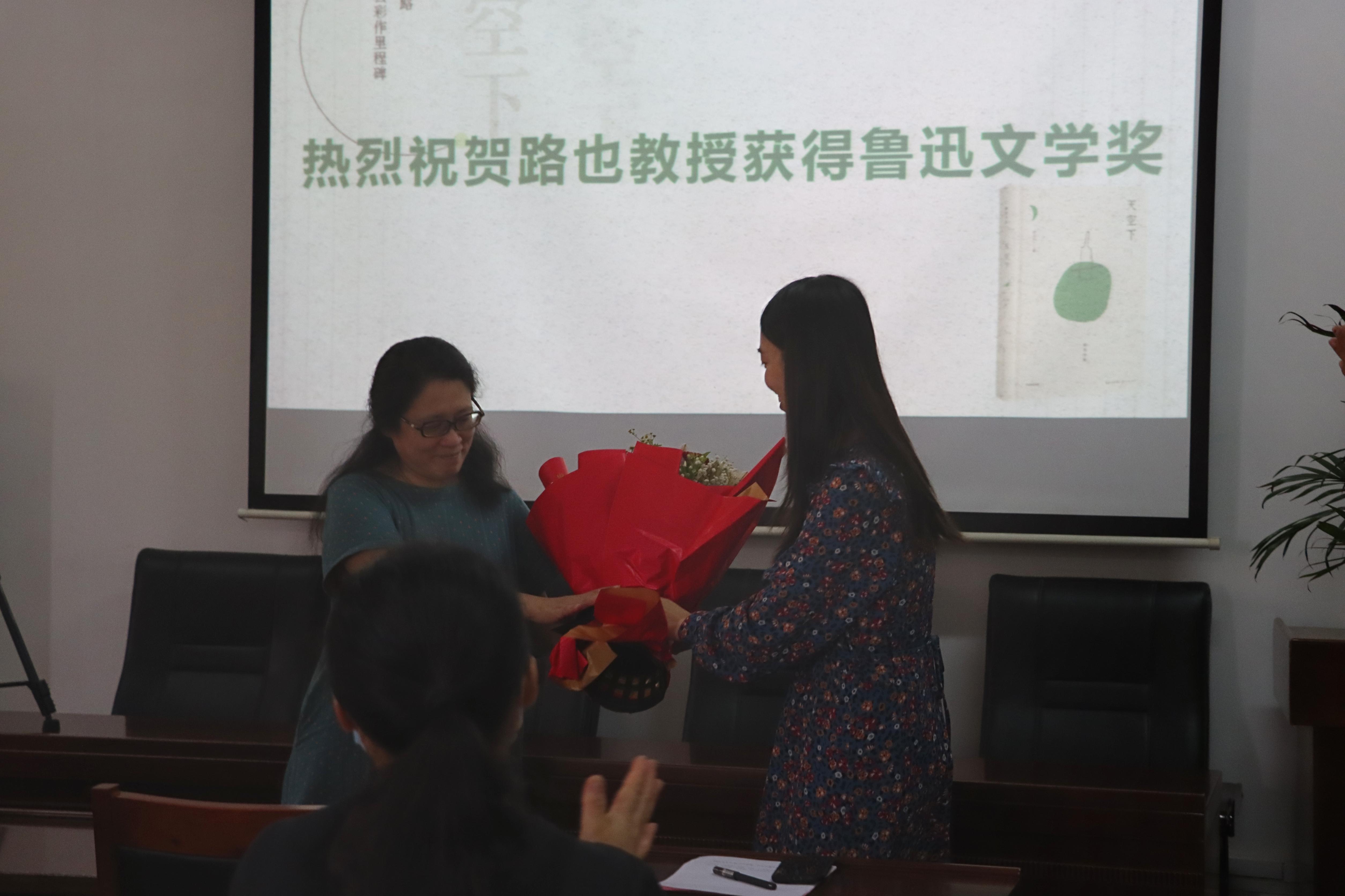 会上,路也教授向大家分享了创作心得,并表示“文学写作是我在这个世界上探索真理的一种方式,这是我喜欢的方式”。对于获奖,路也教授十分谦虚,她总结道:“获奖没什么特别值得说的,就是高兴、感激、激励。”平淡的语言中展现了她对文学始终如一的态度。最后,路也教授特意赠送给在场每一位教职工亲手签名的获奖作品《天空下》,共同分享喜悦。澳门六合彩App