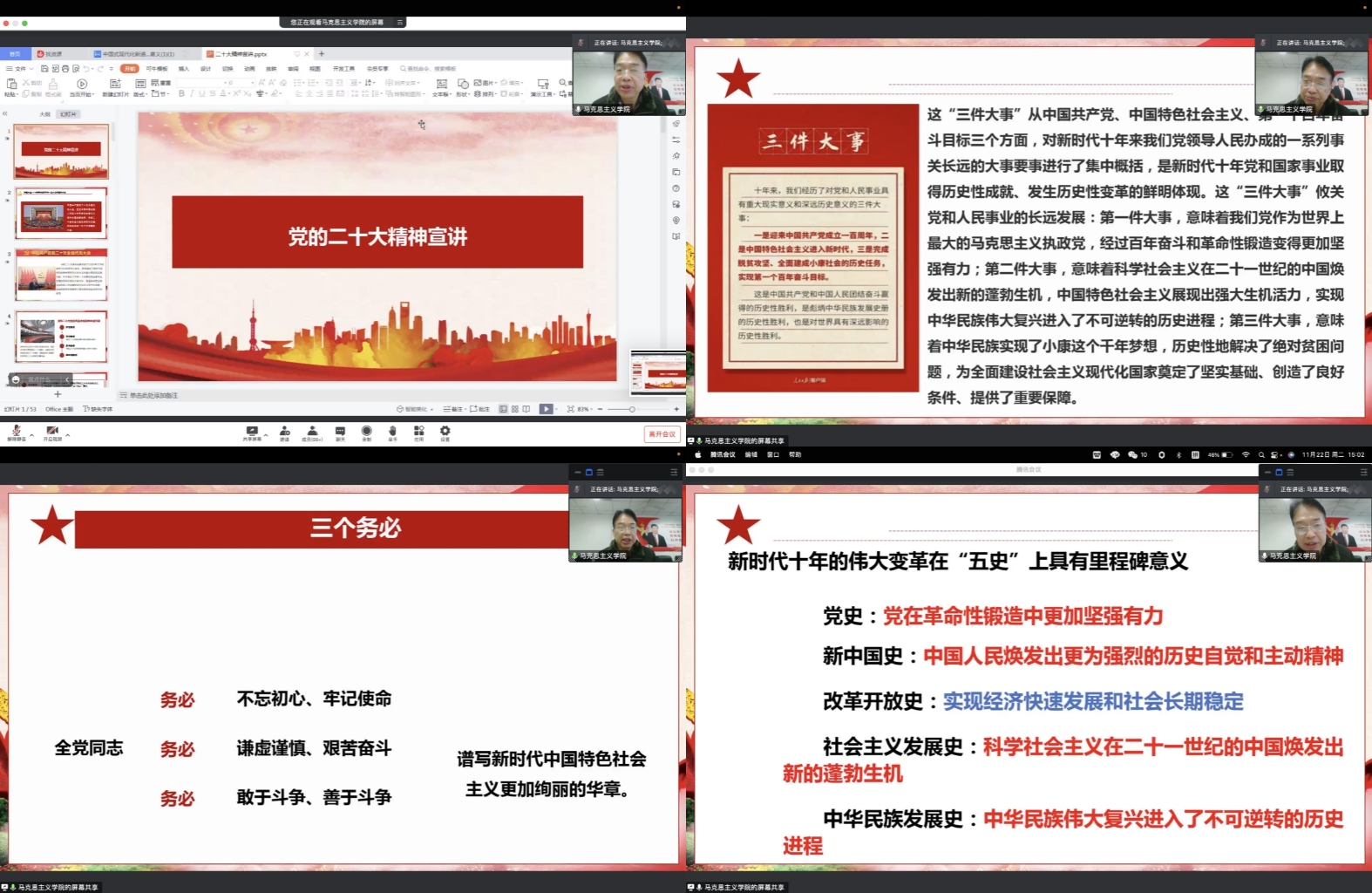 师生深刻理解了党的二十大精神。文教授重点强调了党的二十大的主题、主要成果,并指出要深刻领会过去五年的工作和新时代十年的伟大变革,深刻领会开辟马克思主义中国化时代化新境界,深刻领会中国式现代化,深刻领会全面建设社会主义现代化国家的目标任务,深刻领会坚持党的全面领导和全面从严治党的重大部署,要深刻领悟“两个确立”的决定性意义,增强“四个意识”,坚定“四个自信”,做到“两个维护”。