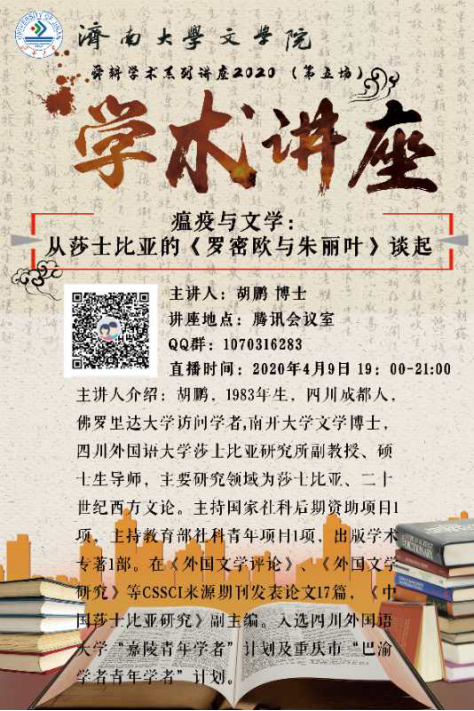 4月9日晚,“舜耕学术系列讲座2020”第五场如期举行。本期邀请到了佛罗里达大学访问学者、四川外国语大学莎士比亚研究所副教授胡鹏先生,讲座题目为《瘟疫与文学:从莎士比亚的<罗密欧与朱丽叶>谈起》。本次讲座采用腾讯课堂直播,澳门六合彩App