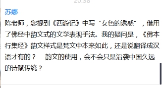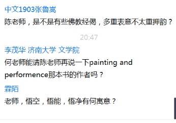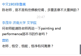 在互动环节,同学们就《西游记》中的韵文样式的来源、佛经的押韵、“悟空、悟能、悟净”的寓意等等问题请教了陈先生。范丽敏教授总结发言,讲座材料非常翔实,讲述严谨,生动有趣,并就“孙悟空的形象来源”与“《西游记》的主角由唐僧变为孙悟空的原因”提出自己的意见,应该重视文学研究中的宗教内容、开展宗教与文学的跨学科研究。
