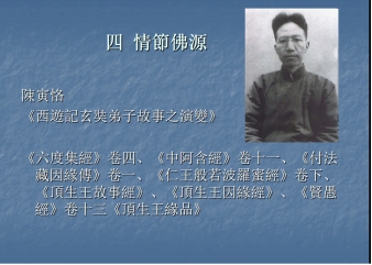 在人物方面,从玄奘到悟空的人物转换中,陈先生认为猴行者以及大闹天宫这一情节可能脱胎于印度佛教文献,唐僧和悟空师徒之间的关系也隐含地彰显出一种佛教的立场。在情节方面,他从大量佛教典籍中找到了《西游记》中“食小儿心肝”、“变化与斗法”、“真正的师傅”和“女色的诱惑”等情节的源头,说明了佛教经书对《西游记》情节方面的影响。在思想方面,他指出“灵山本心”这一在佛教经典中曾出现过的佛教观念在《西游记》中的流露,以及佛道混同这一现象在《西游记》中的呈现;通过对玄奘的三个徒弟都由道转佛的描述,认为在《西游记》中佛教的影响要大于道教。最后,陈先生总结:《西游记》佛道皆有,其中佛教占有很大的比例,形成过程中受到多种因素的影响,处于一种混合状态、多元融合。