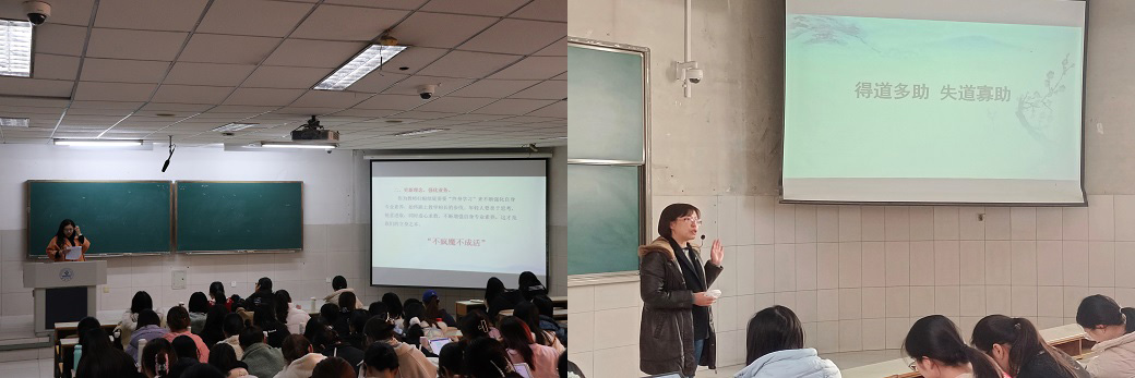 陈琳老师则从诗歌角度入手,强调语文要与古诗结合起来,要有一种诗意的美。她对《木兰诗》进行了教学示范,提出古诗授课应该讲求情景交融,向诗意更深处漫溯。并且教导同学们在教书时应以学生感受和疑问为基础,创设情境,进一步深入解读人物形象,从而对诗文进行深刻咀嚼。课堂的最后,陈琳老师勉励同学们坚定语文教育的初心,无论教书的过程有多少挫折,教育的情怀要一如既往。在陈老师春风化雨般的授课中,同学们受益良多。