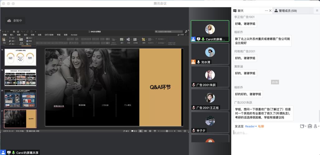 2022年4月23日晚8点,广告学专业邀请群邑(上海)广告有限公司范小玲女士面向广告学专业师生进行了一场线上经验分享交流会。本次交流会围绕大广赛参赛经验、广告公司面试tips、广告行业发展趋势与就业前景等内容展开。广告学专业2020级、2019级学生认真聆听了讲座,广告学专业陈晓洁、徐利、刘水清老师参加了此次交流。