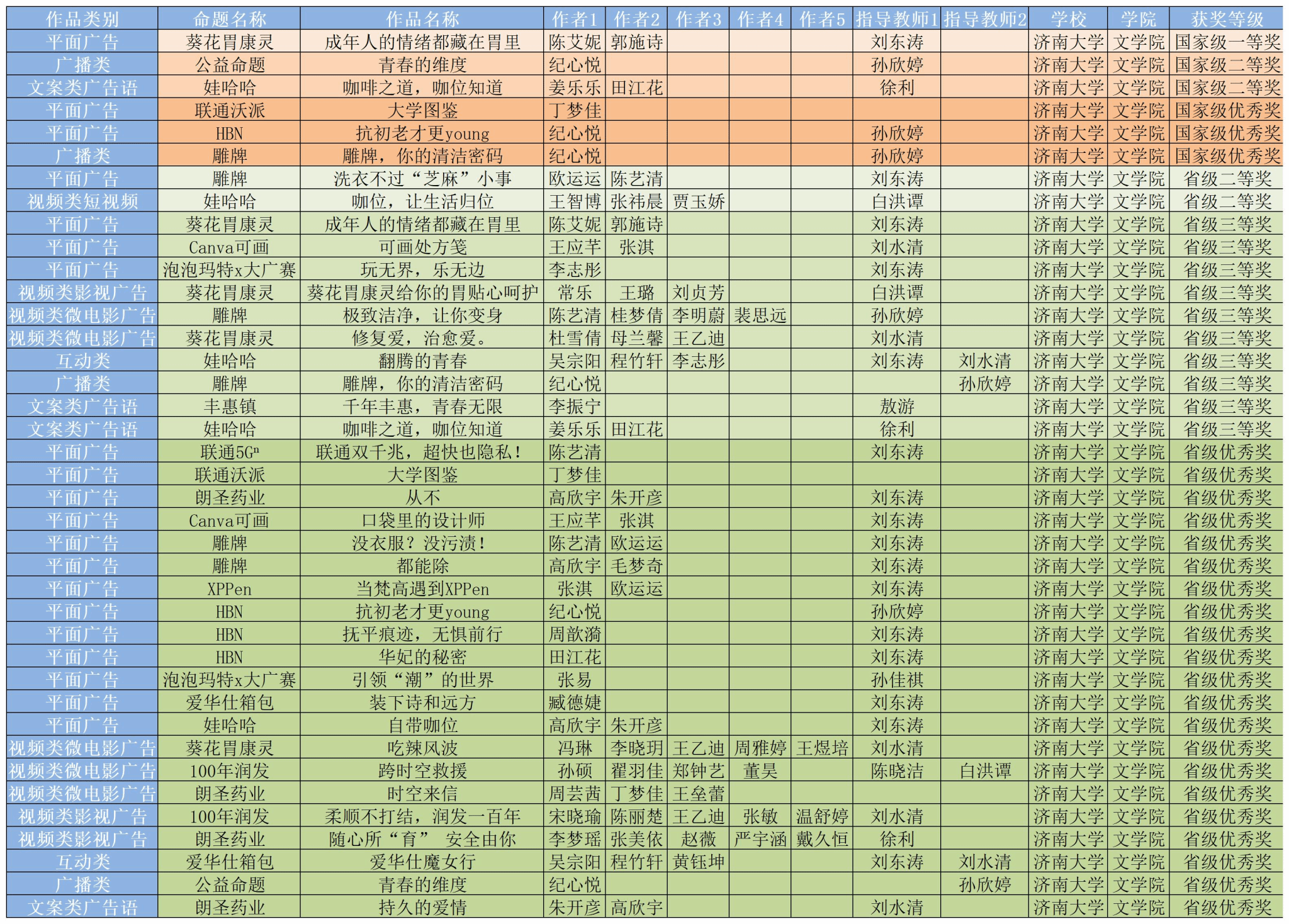 学生在国赛中有平面广告、广播类、文案类广告语、产品与包装4个作品类别分别获得一等奖1项、二等奖2项、优秀奖3项,在省赛中有平面广告、视频类影视广告、视频类微电影广告、视频类短视频、互动类、广播类、文案类广告语7个作品类别分别获得二等奖2项、三等奖10项、优秀奖21项。