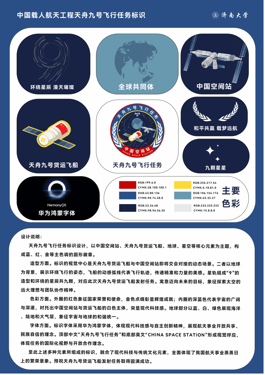 广告学专业教师孙建栋指导广告学学生姚佳设计的“中国载人航天工程天舟九号飞行任务标识”成功入选,成为中国航天事业的重要象征。这一标识将代表中国航天工程中的一项重要任务,成为中国航天精神与科技创新的视觉标志之一。