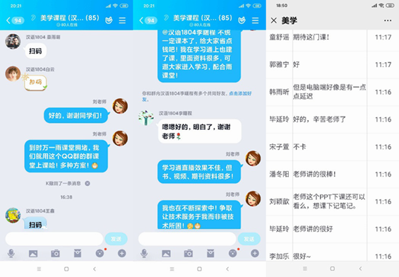 充分发挥了教学管理办公室、学生工作办公室工作队伍的服务保障作用,全面落实每一名师生的线上学习情况,采取灵活方式帮助学生克服困难,通过授课QQ或微信群、毕业论文指导QQ群等保障进行正常的线上学习活动。