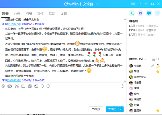 特组织建设有“《大学写作》授课交流QQ群”,由课程负责人夏秀教授对所有《大学写作》授课教师进行培训、辅导,及时沟通“智慧树”平台负责人,解决遇到的各种技术问题等。