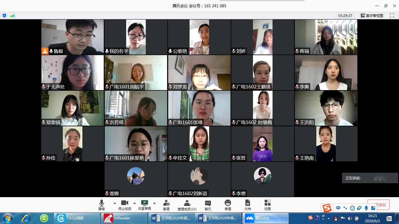 2020届本科毕业生论文第一次答辩顺利进行。因为疫情原因,本次答辩工作采用线上进行的方式,共分为汉语言文学、汉语国际教育、新闻传播学3个大组,其中汉语言文学大组下设现当代文学、文艺学、写作学、古代文学、汉语、外国文学等11个小组,汉语国际教育下设4个小组,新闻传播学下设广播电视学、广告学、编辑出版学等7个小组。本次答辩共有385名学生参加,68名教师参与答辩工作。经过第一次答辩,共有375名学生顺利通过答辩,24人获评校级优秀论文。