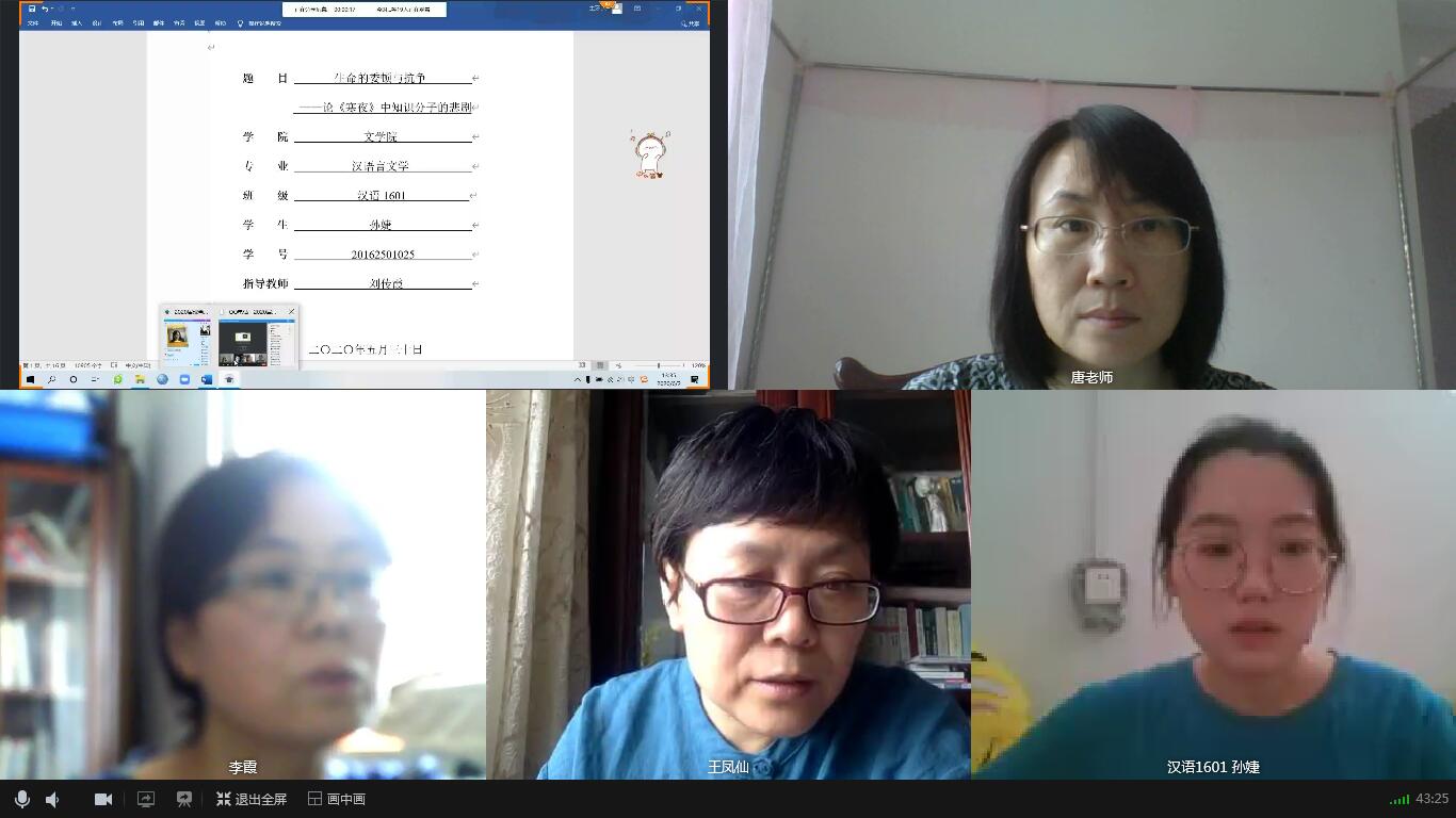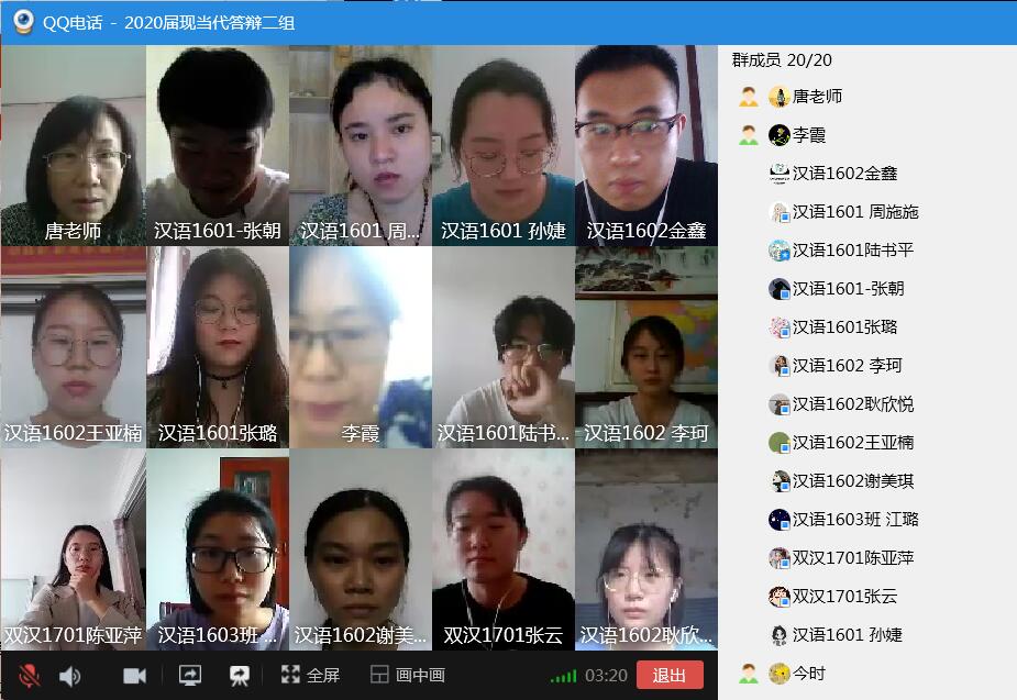 2020届本科毕业生第二次答辩顺利举行。第二次答辩依然采用线上答辩,共分为汉语言文学、新闻传播学两组,共有10名学生参加,7名教师参与答辩工作。经过第二次答辩,10名学生顺利通过。