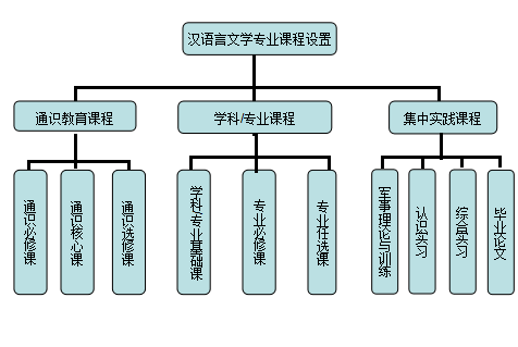 古代汉语(1)、古代汉语(2)、现代汉语(1)、现代汉语(2)、古代文学(1)、古代文学(2)、古代文学(3)、现代文学、当代文学、外国文学(1)、外国文学(2)、文学概论、创意写作、语言学概论、比较文学、美学。