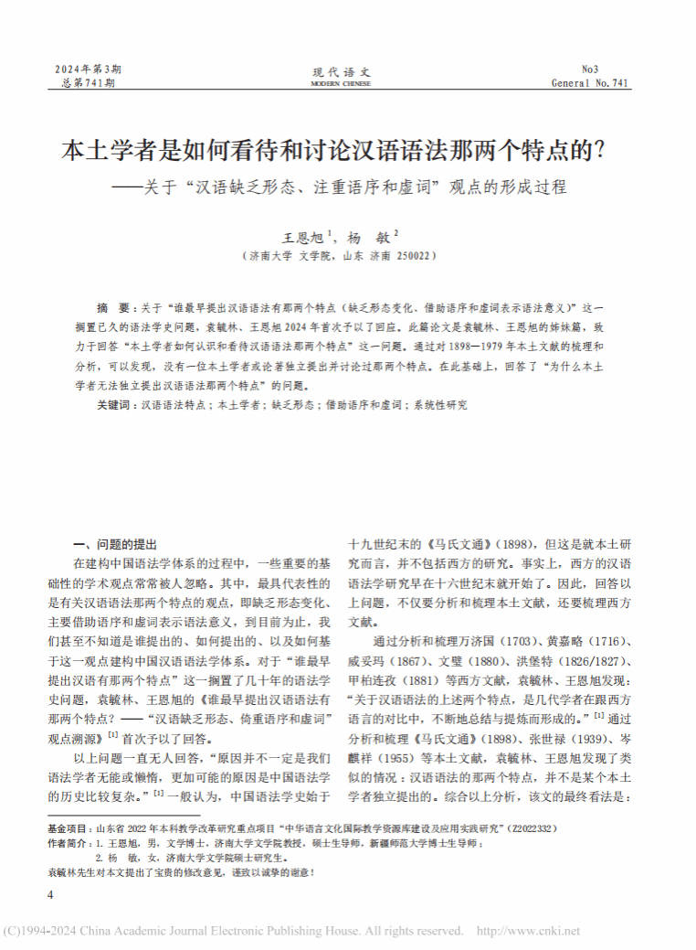 王恩旭副教授与硕士研究生杨敏所撰写的论文《本土学者是如何看待和讨论汉语语法那两个特点的?——关于“汉语缺乏形态、注重语序和虚词”观点的形成过程》于《现代语文》2024年第3期发表。论文为山东省 2022 年本科教学改革研究重点项目“中华语言文化国际教学资源库建设及应用实践研究”(Z2022332)的阶段性成果。