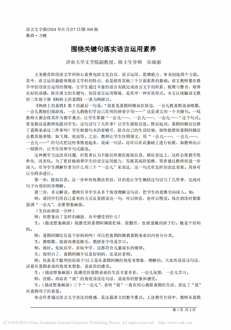 谷瑞丽副教授的文章《围绕关键句落实语言运用素养》于2024年3月27日在《语言文字报》发表。