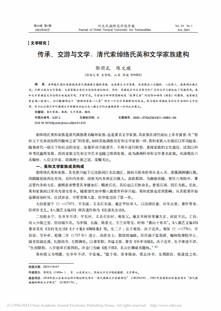 郭前孔副教授的论文《传承、交游与文学:清代索绰络氏英和文学家族建构》于《河北民族师范澳门六合彩App