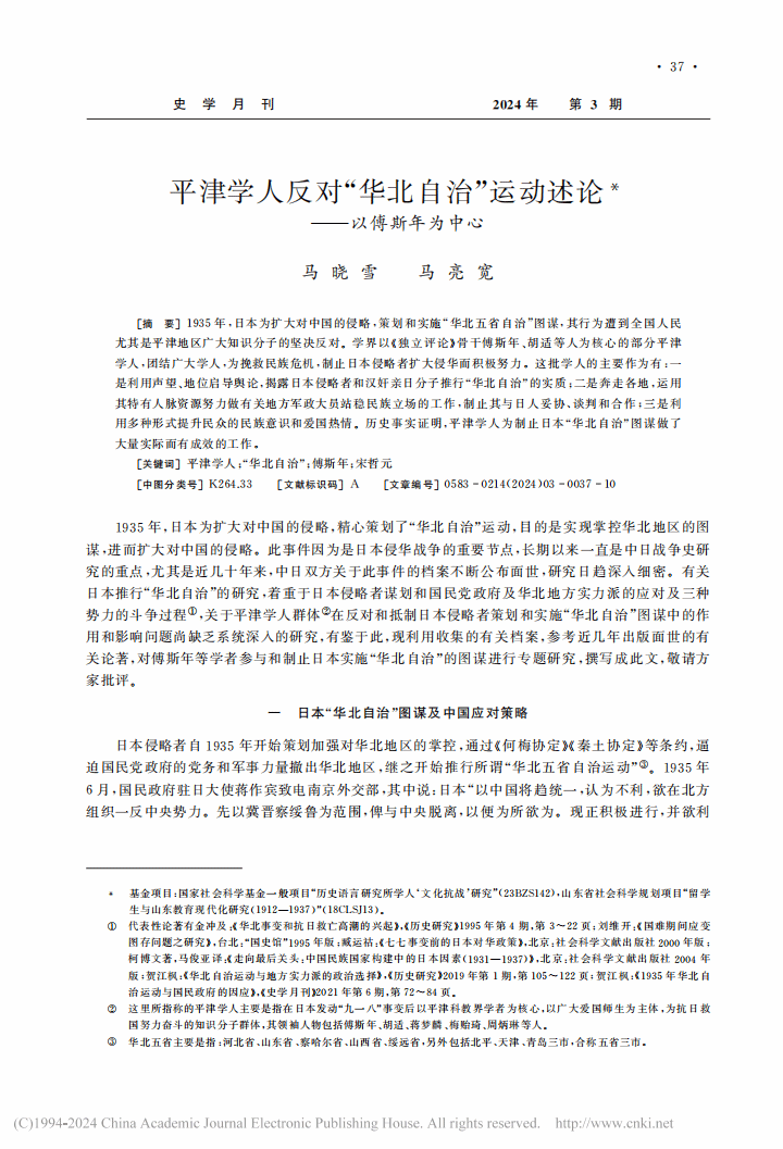 论文认为,1935年,日本为扩大对中国的侵略,策划和实施“华北五省自治”图谋,其行为遭到全国人民尤其是平津地区广大知识分子的坚决反对。学界以《独立评论》骨干傅斯年、胡适等人为核心的部分平津学人,团结广大学人,为挽救民族危机,制止日本侵略者扩大侵华而积极努力。这批学人的主要作为有:一是利用声望、地位启导舆论,揭露日本侵略者和汉奸亲日分子推行“华北自治”的实质;二是奔走各地,运用其特有人脉资源努力做有关地方军政大员站稳民族立场的工作,制止其与日人妥协、谈判和合作;三是利用多种形式提升民众的民族意识和爱国热情。历史事实证明,平津学人为制止日本“华北自治”图谋做了大量实际而有成效的工作。