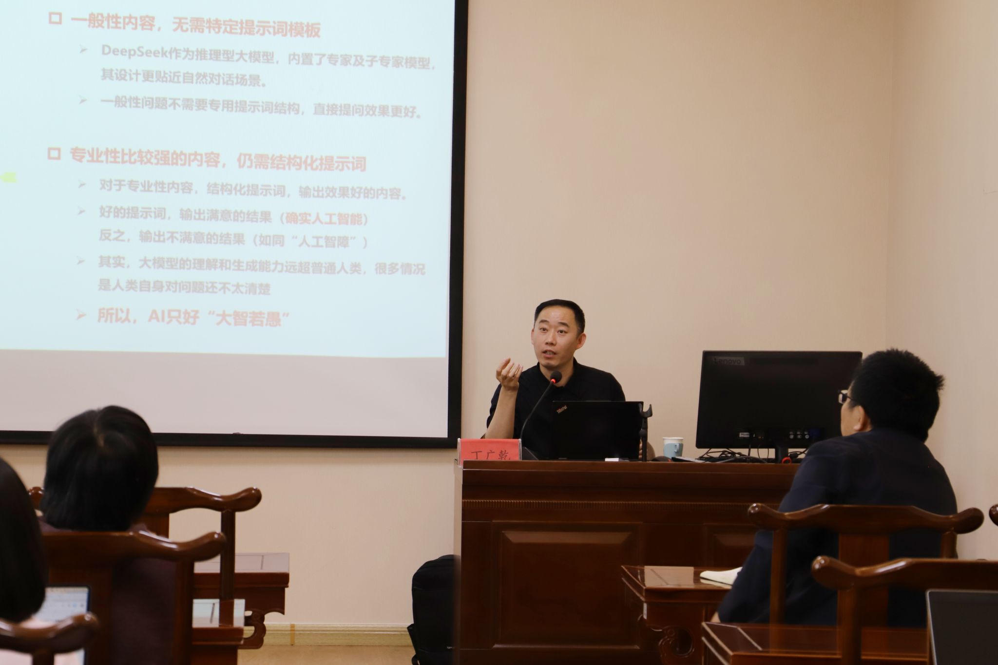 在具体应用层面,丁教授结合实际教学案例,分享了DeepSeek、Kimi等AI工具在备课、教学设计、课件制作、课程题库建设等场景中的应用思路与方法,并现场演示了通过有效提问不断优化AI输出,使其更好地服务于教学目标达成。围绕学生使用AI的现实问题,丁教授还就如何加强规范引导、提升学生技术素养与独立思考能力进行了深入探讨。讲座内容生动形象、案例丰富,现场交流气氛热烈。