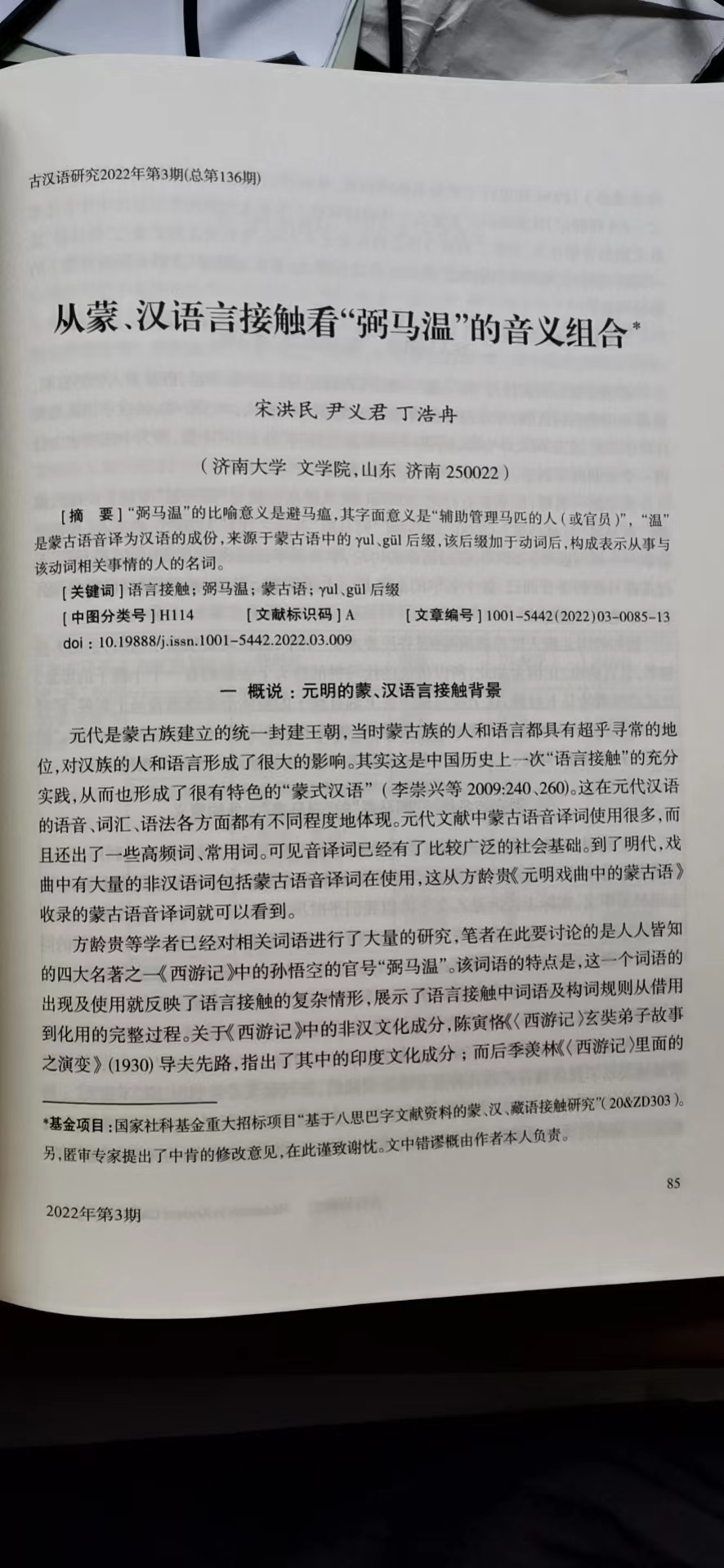 澳门六合彩App 汉语言文字学学科方向带头人宋洪民教授,在《古汉语研究》(CSSCI2022年第3期(总第136期)发表学术论文,《从蒙、汉语言接触看“弼马温”的音义组合》,本课题为宋教授主持的国家社科基金重大招标项目“基于八思巴字文献资料的蒙、汉、藏语接触研究”(项目编号:20&ZD303)阶段性成果。