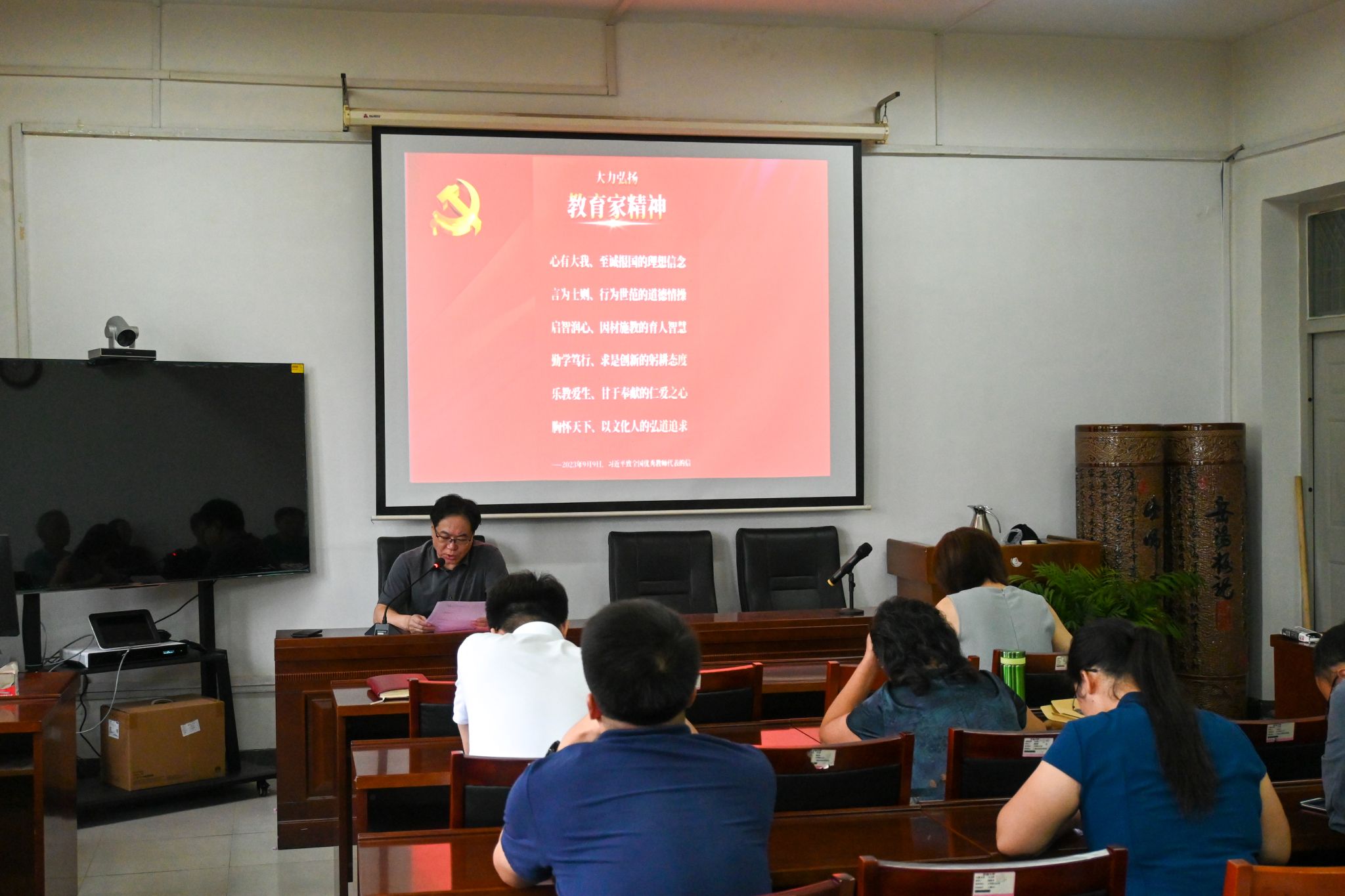 董海军领学了习近平总书记教师节重要指示精神,他指出,习近平总书记教师节重要指示精神充分体现了党中央、国务院对广大教师的关切关怀,对全国教师是极大的鼓舞。习近平总书记致信全国优秀教师代表强调要大力弘扬教育家精神,为新时代人民教师指明了前进方向,为新征程教师队伍建设提供了根本遵循。广大教师在深受鼓舞、倍感自豪的同时,更要牢记总书记关于“大力弘扬教育家精神”的殷殷嘱托,在教育强国建设新征程上踔厉奋进、再建新功。